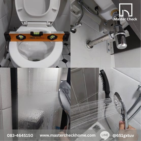 สิ่งที่เราตรวจ ทำการทดสอบขังน้ำและปล่อยน้ำ (Ponding Test) เพื่อดูความลาดเอียง (Slope) ของพื้นห้องน้ำและระเบียง น้ำต้องไหลลง Floor Drain ได้คล่องตัว ไม่ขังเป็นแอ่ง ป้องกันปัญหาตะไคร่น้ำและกลิ่นเหม็นอับ